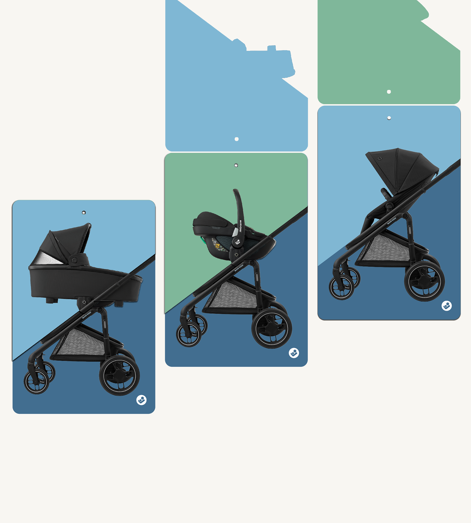 Hangtag, poster, and Instagram story concepts promoting Maxi-Cosi's Plaza+ 3-in-1 stroller, designed as part of an application process for Dorel Juvenile.